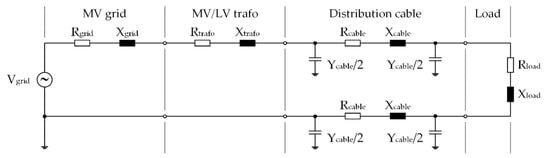 The MV grid and the MV/LV power transformer are modeled as a Thévenin equivalent circuit, i.e., an ideal voltage source behind an equivalent impedance, the distribution cables are modeled as a π-model equivalent and the loads are modeled as a load-equivalent impedance. Modeling of all this equipment is illustrated in Figure 2, with the mention that all distribution cables have four identical wires, of which three are for phases and one is neutral. The ideal voltage source, labeled Vgrid, has the same voltage as the LV network in no-load conditions.