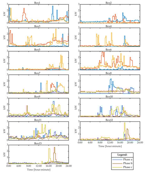 Figure 3 presents the 24 h aggregate load profiles and, more specifically, the active power profiles, for each distribution box of the LV network shown in Figure 1 for data set 1. As mentioned in previous sections, the load profiles have been acquired by smart meters and are stored in their internal memory on a 15 min average interval. Consequently, there are 4 samples per hour, and 96 samples for the entire 24 h profile duration. All loads are residential and therefore characterized by an almost unitary power factor, so their reactive power exchange with the grid is not significant. The reactive power of each load is still considered in this power quality study, but the reactive power load profiles are not shown in this paper.