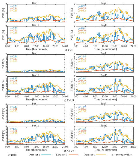 Figure 4 presents the VUF, PVUR and AVUF for four distribution boxes of the LV network. All these indicators are zero for data set 2 because in this case, all loads are balanced, so Figure 4 shows results only for the other three data sets. Figure 4 shows both the 24 h profiles of the mentioned voltage imbalance indicators and their 24 h average value, denoted by µ. The distribution boxes under observation have been selected so that they are spread over the entire length of the distribution feeder.