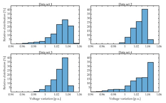 Figure 6 presents the relative distribution of phase-to-neutral voltage magnitude for the 23 loads of the considered LV distribution network for each set of load data. As can be seen in this figure, the relative distribution of voltage bins depends on the load data that are used. For example, the voltage variation is smaller for data set 2, i.e., when the loads are balanced, and for data set 3, whose relative distribution is not much different from that of data set 2. In comparison, the voltage varies more widely for data sets 1 and 4, as there are more voltage bins for these two sets of load data.