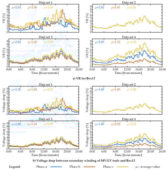 Another interesting result is represented by the comparison of the lowest voltage bin for each data set, which is 0.95–0.96 p.u. for data set 1, 0.99–1.00 p.u. for data set 2, 0.98–0.99 for data set 3 and 0.94–0.95 for data set 4. This result shows that inadequate load imbalance assumptions could lead to inaccurate estimates regarding the minimum voltage magnitude, especially at the end of LV feeders. This conclusion is also supported by observations on VR and voltage drops for distribution box 13, which are shown in Figure 7.