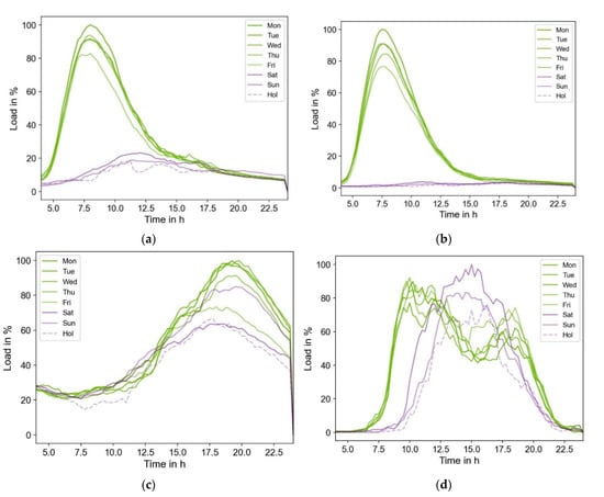 Aggregated daily load curves of the categories of charging sites. The weekdays from Monday to Friday are in green, and weekends and public holidays are in purple: (a) Car park; (b) Office; (c) Residential; (d) Shopping center.