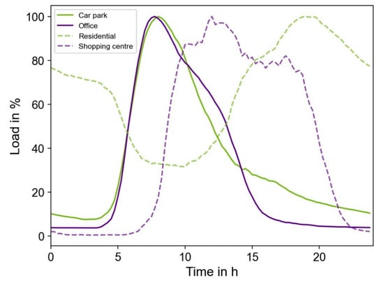 Figure 1 shows that car parks and offices have very similar load curves with the exception that car parks have more charging activities during the weekends and public holidays as the offices. The peak at both car parks and offices is roughly between 7:45 h and 8 h. On the contrary, residential charging sites possess very different charging characteristics. The load peak at the residential sites is about 20 h, and the valley period is during the early morning hours. Thus, charging load is heavily concentrated in late evenings and nighttime, although light load also occurs during the day. At residential sites, the load profile does not change dramatically between weekdays, weekends, and public holidays. In the case of shopping centers, the peak period is more dispersed than in the case of car parks, offices, and residential sites. The peak time at the shopping centers is roughly from 8 h to 19 h, which corresponds with the opening hours of most of their activities. The average peak loads of a day together with the times of occurrence are presented in Table 2.