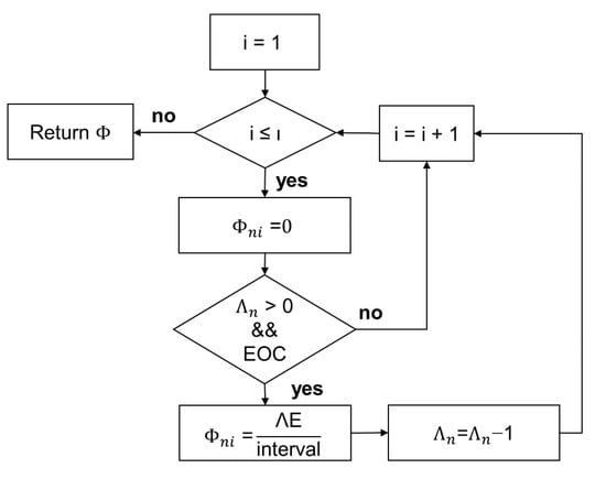 where is the number of all considered sessions. Analogous to (2) ι represents the considered intervals. The flexible sessions Λ are the difference between the parking time and the charging time in the dimension of 15 min intervals. The flowchart in Figure 3 indicates in a simplified manner how a row n of the flexibility pattern is determined.