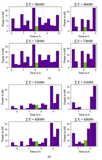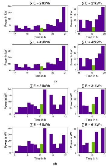 The optimal schedules of load reduction for each category of charging sites are illustrated in Figure 4. In order to keep the paper as concise as possible, schedules for 2 different amounts of energy and two different time windows, 2 h and 4 h, are shown. The green bar indicates the average time of the load peak, which can also be seen in Table 2. The time windows are balanced so that the peak load is in the middle.