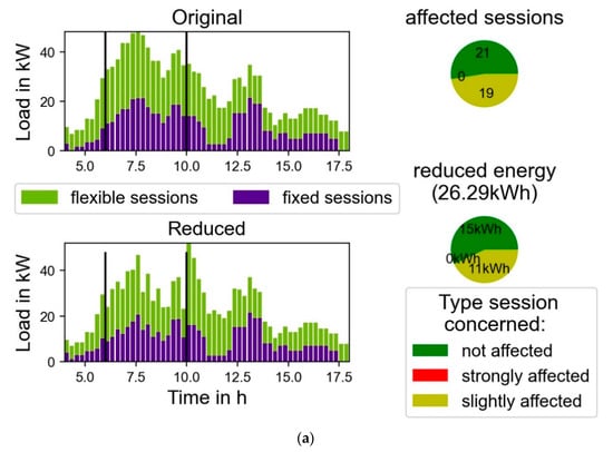 Figure 4 shows the scaled values of the optimal schedule during the last day of the study period (31st of January 2020). The optimal load schedules for other days are obtained by using the values in κ. Figure 5 illustrates load reduction during a single day. Since no overall conclusions can be drawn from individual days, the idea is to provide a more tangible picture of how the optimal load reduction schedules are seen in a daily load curve. The days are selected arbitrarily among the business days. A time window of four hours is used as in the results of Figure 4. Again, the time window is balanced around the average peak hour so that the peak is in the middle of the time window. The beginning and the end of the time window is marked with purple bars. On the left side, the original (above) and the reduced load curves (below) are shown together with their flexibility potential. The purple parts show the fixed charging sessions from the total load and the green part indicates the flexible sessions. A flexible session means that the charging time is shorter than the parking time. A fixed session means that the charging time equals the parking time. On the right side, the pie charts illustrate the number of affected sessions (above) as well as how the reduced energy is divided between the affected and the non-affected sessions (below). A charging session is considered to be non-affected if the customer can charge the same energy as the original demand of the charging session. This is due to the fact that their parking time exceeds the charging time at a level that the loss of their original charged energy can still be fully charged. The charging session is slightly affected if more than 80%, but less than 100% of the sessions’ original energy is charged and strongly affected if less than 80% of the original energy is charged.