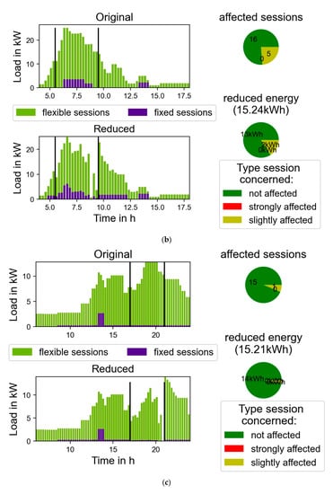 The daily load curves in Figure 5 show that the impact on customers is relatively small in the four presented categories. If an EV charges less than 80% of the original energy, the charging session is categorized as strongly affected. It should be considered that this 80% is not the state-of-charge of the battery. It is very rare that a customer arrives at a charging site with a completely empty battery. This means that even in the case of strongly affected sessions, the batteries of the EVs are charged more than 80% of their state-of-charge. In practice, many customers hardly notice such an impact in daily use. The examples on the effect of load reduction on daily load curves in Figure 5 reveal a new peak that happens directly after the load reduction. This peak can be even higher than the original peak and, thus, must be considered in practical applications. It is also true that if load is reduced at a charging site and the customers who could not fully charge their vehicle during the charging session, they will have to charge more energy at the next charging site, causing the peak of demand to move somewhere else.