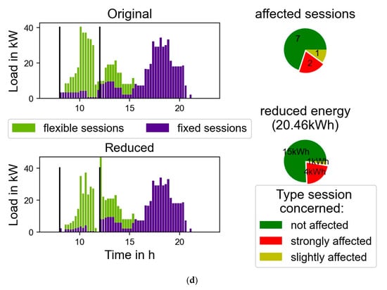 Optimal schedules of load reduction during a single day with a window of four hours (marked in purple). The upper left parts illustrate the original load curve and the lower left parts the reduced load curve. The flexible sessions are marked in red and the non-flexible charging sessions in green. The purple lines show the time window of the load reduction. The right side shows the impact of load reduction on the customers: (a) Car park; (b) Office; (c) Residential; (d) Shopping center.