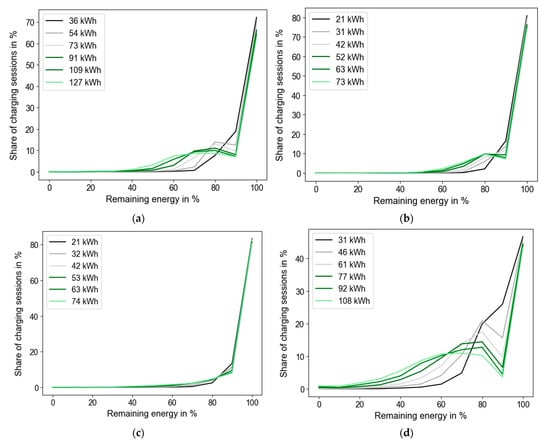 By comparing plots in Figure 6a–d, it can be observed that office and residential sites are less affected by the optimal load reduction than the charging sites at the shopping centers. Car parks seem to place in between these two extremes. When the minimum amount of daily energy is reduced, that is, 36 kWh for car parks, 21 kWh for offices and residential sites, and 31 kWh for shopping centers, at office and residential sites all customers could charge more than 60% and nearly all customers more than 90% of the original energy. At car parks all customers could charge more than 50% and at shopping centers more than 40% of the original energy. At car parks, only a minimal number of sessions could charge less than 80% and at shopping centers less than 60%. Naturally, the impact of load reduction on charging sessions becomes more evident with an increasing amount of reduced energy. With the largest amount of reduced daily energy, 127 kWh at car parks, 73 kWh at office sites, 74 kWh at residential sites, and 108 kWh at shopping centers, it is seen that only office sites have non-affected sessions. However, there is only a hardly distinguishable number of charging sessions that could charge less than 60% of the original energy, except at shopping centers.