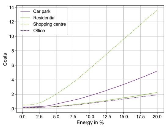 Figure 7 confirms the findings of Figure 6 to show that offices and residential charging sites provide the largest potential of load reduction with the least impact on customers. The cost function is minimally lower at office sites than at residential sites with larger amounts of reduced energy. However, because the cost function is quadratic, the differences are somewhat exaggerated in order to see the differences. Without a quadratic cost function, the office and residential sites provide very similar results. The reason why the impact of optimal load reduction on customers is the lowest at offices is because offices sites have the most consistent charging hours. This means that the employees arrive roughly at the same hours in the morning and stay there during the whole working day. Such behavior provides very good predictability with a view to network ancillary services. Along the same analogy, the charging schedule at residential sites seems to be slightly less consistent than at office sites, due to the fact that the daily charging load at car parks is likely to be highly dependent on the location and on the pricing, which dictate the kind of customers that are using the charging services. If a car park is predominantly used by office workers, residential customers living in the proximity of the site, or park and ride customers, the cost function is likely to appear very similar to office and residential sites. Thus, before generalizing the results for car parks, differences and similarities between different car parks should be studied in more detail. Perhaps car parks could be divided into several sub-categories, depending on the charging characteristics, the location, or the type of customers. Shopping centers are the least attractive category for load reduction, likely due to the fact that they offer a large variety of services during an extent period of the day. Shopping centers have more reasons that may impact their load behavior more than the other three types of charging sites, such as winter and summer sales, and pre-Christmas shopping.