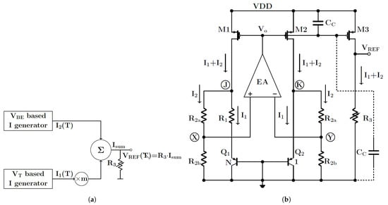 Bandgap (BG) voltage references are widely used in integrated circuits, since each provides a constant voltage, regardless of process, power supply voltage and temperature (PVT) variations. In recent years, the electronics trend has been pushing towards reducing power supplies down to 1.2 V or lower while maintaining or improving measures of performance, such as robustness and current consumption. Thus, voltage-mode BGs cannot be used, since the natural silicon bandgap voltage of 1.25 V would be higher than the supply. For this reason, to avoid switching structure [,], current-mode reverse-BGs (R-BG) are typically used [,,,,,], whose conceptual scheme is shown in Figure 1a. This scheme produces a PVT-independent output voltage VREF by means of the sum of two currents over output resistance R3: VT-based (VT = k·T/q) current proportional to absolute temperature (PTAT component, I1) and VEB-based current complementary to absolute temperature (CTAT component, I2). VT-based current is multiplied by a constant factor to have the PTAT component be equal to the CTAT one. The summed current flows into a resistor to generate a temperature-independent output voltage VREF.