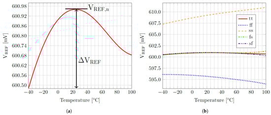 Figure 2a presents a typical bandgap curve. It is not flat because the term is not constant, and it depends on the technology. Flatness is optimized for m calculated at 27 °C (300 K). Its value is usually around −2 mV/°C at 27 °C. On the contrary, the term is constant with a value of 0.086 mV/°C. The typical slow and fast corners of the BG curve are compared in Figure 2b. As can be seen in ss and ff, the curve is not centered at 27 °C as in tt corner. This is due to the change in the R1 value that is calibrated on the nominal corner.