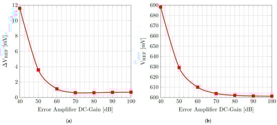 Figure 3a shows the dependence of ΔVREF on the DC-gain. For instance, a minimum DC-gain of 55 dB is required to have a ΔVREF lower than 2 mV. Figure 3b depicts the accuracy of the target VREF versus the DC-gain, assuming a nominal target VREF,n of 600 mV. In order to have a constant VREF even in presence of DC-gain deviation (due to PVT) around its nominal value, the minimum DC-gain has to be larger than 75 dB. The resulting VREF is constant, and then compensated by trimming. However, once the trimming is set for a given DC-gain, any further DC-gain deviation (due to PVT) results in residual ΔVREF. This means that the target DC-gain has to be in a region where VREF has flat behavior with respect to DC-gain, in order to avoid accidental ΔVREF, as would occur for low DC-gain; take the value of 50 dB as an example.