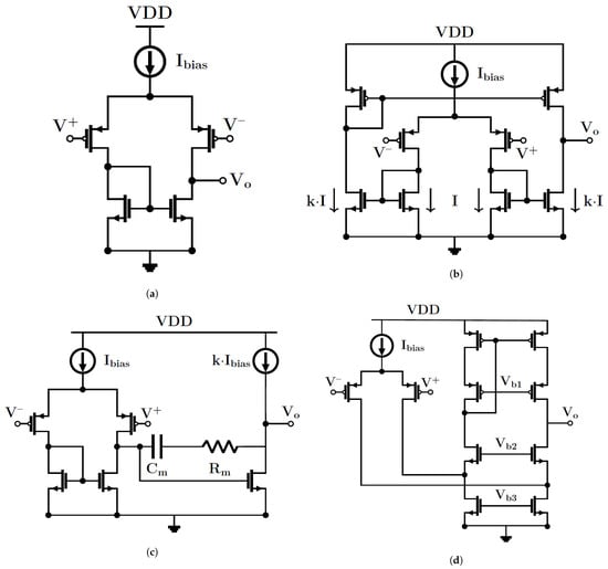 (a) Single-stage, (b) symmetrical, (c) two-stage Miller and (d) folded cascode OTAs.