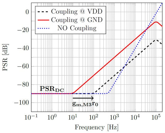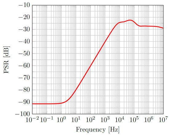 Power supply rejection (PSR) [] is a critical parameter, particularly in LV circuits, where any disturber is more important than at high voltages. At low power, the impedance level is higher and so small current errors could result in large voltage errors. For the basic R-BG scheme and assuming the use of a symmetrical EA, the PSR frequency response is shown by the solid line in Figure 5. The DC-PSR value is given by the following equation: