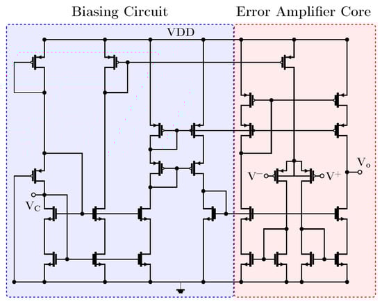 The above requirements have to be satisfied by the EA design. The required target DC-gain can be achieved by using long devices and/or multistage opamp structures. Voff can be reduced (avoiding switching schemes is to be carefully considered) by using large area devices (i.e., large WxL) []. In addition, also lowering the current level with MOS in the saturation region would increase DC-gain. Then, the device design can be optimized for low power by operating the transistors in the sub-threshold region, thereby maximizing the intrinsic gain of the transistor (proportionally to VA/VT, where VA is the early voltage) for a given current level. Moreover, lower VGS is required, thereby reducing minimum supply voltage and/or enabling cascode structures. Different EA topologies could be compared, as follows [].