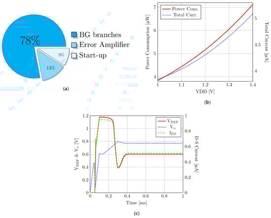 According to Figure 3, to guarantee a ΔVREF lower than 1 mV in the temperature range [−40, 100] °C and a maximum trimming range of about 30 mV, EA DC-gain larger than 70 dB is needed. To avoid values that exceed this error during PVT simulations, a gain of 80 dB was chosen. Input stage and output stage currents are in the order of 40 nA each—negligible with respect to the BG branches, as expected. In Figure 8a a pie chart is reported with the power breakdown of the total BG structure. Figure 8b shows the power consumption and the total current of the BG depending on the supply.