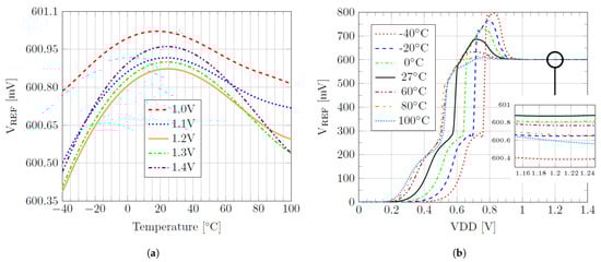 The dependency of VREF on the supply voltage is shown in Figure 10b. The R-BG properly operated for VDD levels as low as 1 V. The ΔVREF for VDD between 1.0 and 1.4 V was 0.44 mV.