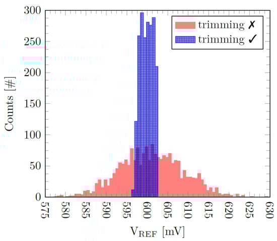Combined histogram of Monte Carlo VREF with (grid) and without trimming (solid) at 27 °C and 1.2 V of VDD.