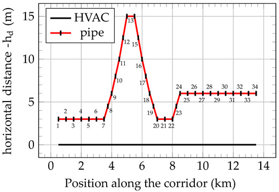Figure 2 shows the geometric characteristics of the considered power line, that is, the positions of the power wires and Overhead Ground Wire (OGW), as well as the burial depth and relative position of the pipeline and four different mitigation wires. The x coordinate of the pipeline conductor is reported as an interval, corresponding to the position of the pipeline (and mitigation wires) with respect to the power line center for each of the 34 cross-sections of the routing marked in Figure 1. In [28], the influence on the mitigation effectiveness of the number and burial depth of the screening conductors has been assessed. As reported in Figure 2, a constant burial depth of was used in this work for the sake of practicality.