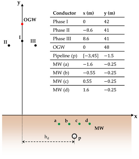 Geometric characteristics of the considered power line, pipeline and mitigation wires.