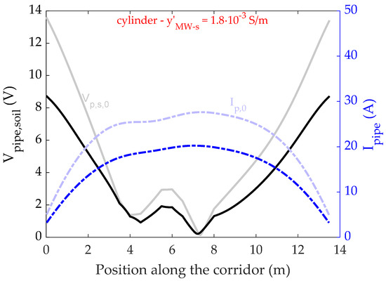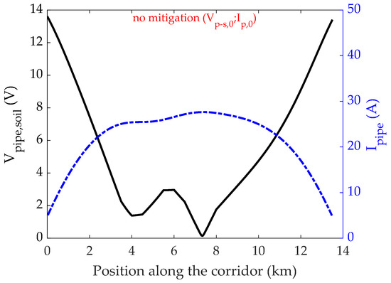 In order to provide a reference case for the evaluation of different mitigation techniques performed in the next sections, the configuration described in the previous paragraph is first assessed without any mitigation device. Figure 3 shows the magnitudes of the obtained longitudinal pipeline current and pipeline-to-soil voltage along the length of exposure, yielded by the network analysis. It is worth highlighting that—even if the term network analysis is used for the sake of conciseness—the tableau analysis is carried out using physical information extracted through finite element analysis of the discretised domain, as described in the previous section. The obtained results show that both the induced voltage-to-soil and current may reach considerable values, requiring the employment of mitigation means [32].