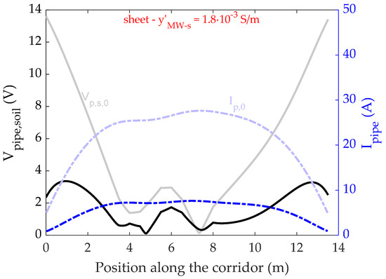 Magnitude of induced pipe-to-soil voltage and longitudinal pipe current along the corridor, when a single conductive sheet is buried above the pipeline.