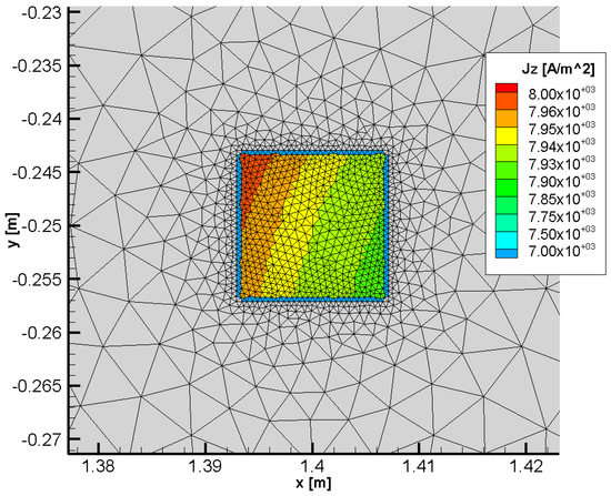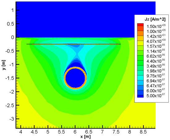 The 2D spatial current density distribution in the appurtenances of the pipeline and the mitigating steel sheet can be observed in Figure 8. The plot highlights the shadowing effect produced by the current density induced in the mitigation sheet by the magnetic field produced by the power line.