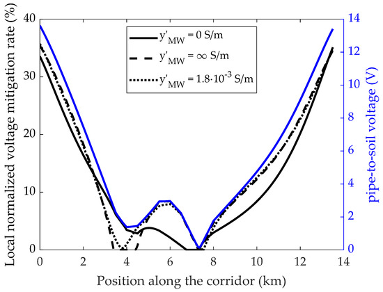 Finally, Figure 9 and Figure 10 depict the local normalized voltage and current mitigation rates along the corridor when cylindrical mitigation wires are employed, respectively. The mitigation rate in Equation (4) is referred to the section of the corridor corresponding to the maximum unmitigated voltage or current, whereas the local mitigation rate is defined as: