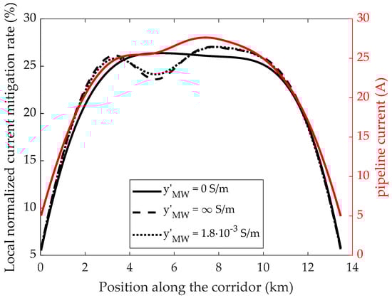 Normalized local current mitigation rate along the corridor for three different values of p.u.l. admittance to earth of the four (cylindrical) mitigation wires (left axis); unmitigated pipeline current (right axis).