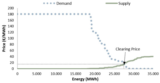 The market operator performs the aggregation of the supply-side bids and the aggregation of the demand-side offers by establishing the supply and demand curves, respectively. The resulting balance of equality between the supply and demand curves determines the price of energy during the period in question, the clearing price, illustrated in Figure 1.