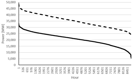 Table 1 presents the Iberian countries’ real installed capacity in 2018 and their programmed capacity by 2030. The non-RES load (nRESL) is the residual load that has to be satisfied by non-RES technologies. In 2018, the nRESL was 186 TWh, around 59% of the total demand, while by 2030 it is expected to decrease to 117 TWh, around 35% of the total demand [27,28]. Analysing Table 1, it is possible to verify that in 2018 Portugal was dependent on the interconnection with Spain, since its thermal capacity was not enough to surpass its peak nRESL and it had a negative nRESL, when it can export to Spain or have to curtail VRES. That dependency is expected to increase in 2030 when the Portuguese thermal capacity will decrease and its peak and minimum nRESL will increase. In 2030, the minimum nRESL of the Portuguese power system will be lower than the interconnection capacity with Spain. This excess of energy could force some RES curtailments to guarantee the security of the power system.