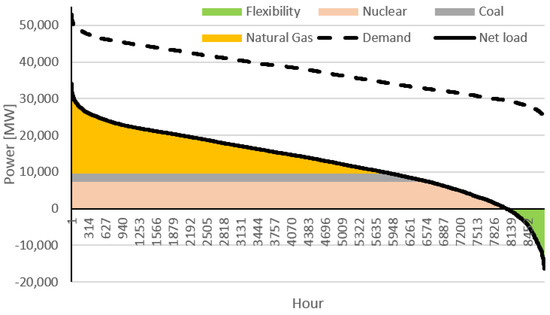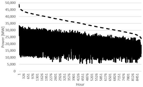 From this figure, it is possible to conclude that annually the production of renewable energy is barely uniform, since the difference between the demand and the nRESL monotone curves is practically constant. However, the stochastic nature of VRES make them highly unpredictable, with substantial hourly variations. Therefore, when comparing each hour of the Iberian demand monotone curve with its respective hourly net load, it is possible to verify a high variability with a decreasing tendency because of the strategic operation of hydroelectric power plants (see Figure 3).