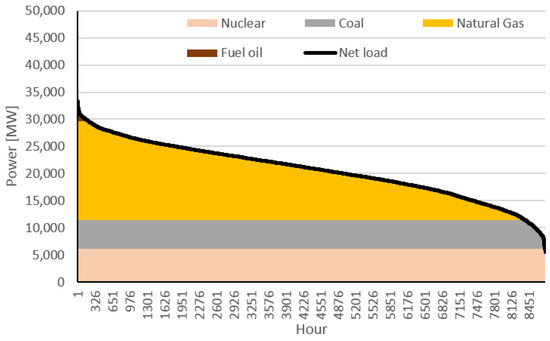 Figure 4 presents the division of the 2018 net-load curve by technology. Figure 4 shows that fuel-oil technology is barely used and the majority of the nRESL is supported by CCGT power plants. Under these conditions, 10 h of market splitting was detected because the market algorithm identified an optimal exchange from Portugal to Spain higher than the interconnection capacity. These cases occurred when the minimum nRESL of Portugal was lower than the capacity to exchange energy with Spain (see Table 1).