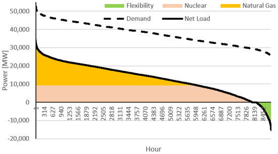 Analysing Figure 5, it can be concluded that by 2030 the number of occurrences of a negative net-load is substantial (704). Furthermore, the economically “optimal” number of 704 shut-down and start-up occurrences of nuclear power plants is also not suited to their technical capability, which can conduct to curtailments of VRES by 3.5 TWh, around 1% of the total demand. Even so, the optimal number of hours that require the flexibility of nuclear power plants can ascend to 2161, which requires a maximum power flexibility of 7.4 GW and energy flexibility of 4.8 TWh, around 1.5% of the total demand. The pumping capacity of the Iberian power system and the interconnection capacity with its neighbours is expected to ascend to 8.49 GW and 9.60 GW by 2030, respectively. However, while HPPs are dependent on their reservoir capacity to use pumping, the need to export energy to neighbouring countries is dependent on market results. If the market prices on neighbouring markets are higher than on the Iberian market of electricity (MIBEL), the Iberian countries will export; otherwise, they will import, which increases their need for power flexibility. To completely avoid VRES curtailments and assure a secure operation of nuclear power plants, there is a need for 23.83 GW of flexible power and 13.5 TWh of flexible energy. Even considering the optimal scenario in which the Iberian power system has all pumping mechanisms operating at full capacity and exports energy, considering the total interconnection capacity there will be a need for an extra 5.74 GW of power flexibility to completely avoid curtailments. In conclusion, by 2030, there will exist a strong need for new sources of energy flexibility that can be provided from storage, demand response and sector coupling. Energy flexibility can enable a secure operation of nuclear power plants and a reduced number of VRES curtailments.