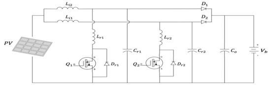 To simplify the analysis of the quasi-resonant converter without loss of generality, we assume the voltage drop across all semiconductor elements and diodes in the on-state is negligible. Further, the input current and output voltage ripples are not considered in the design. To satisfy the previous assumptions, the values of the inductors and along with the output capacitor are chosen to be high enough such that the voltage of output capacitor and the current through the inductors are constant DC values. Hence, inductors and as well as the PV module are modeled as a DC current source . Similarly, the battery voltage together with the output capacitor are replaced by a DC voltage source as shown in Figure 2.