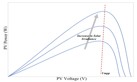 The P-V characteristics curve is different for each specific irradiance. Using P&O, the value of the voltage at maximum power point () is obtained as shown in Figure 4. As the irradiance changes, , which is the peak voltage at maximum power, is extracted.