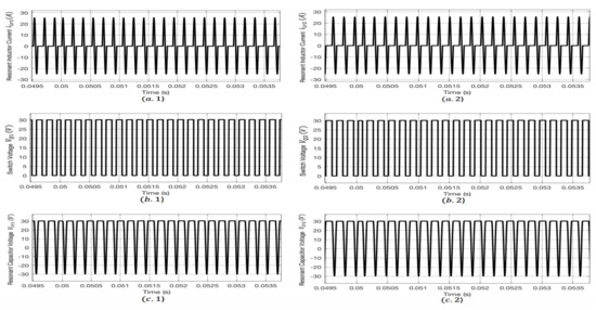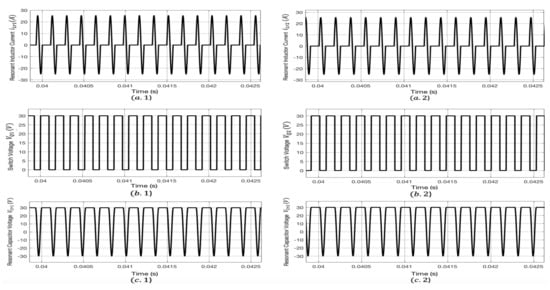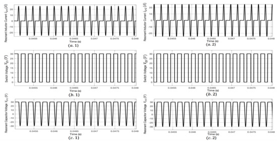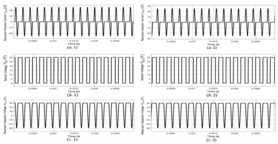 where and are the currents of resonant inductors and , respectively. Further, and are the voltages across the resonant capacitors and , respectively. The initial values of the resonant inductors’ currents are assumed to be zero, hence we have