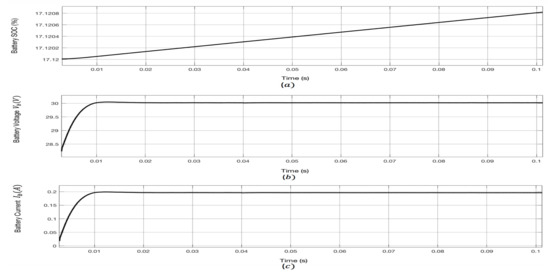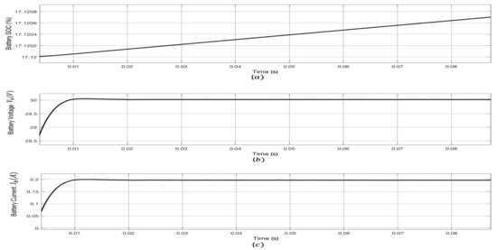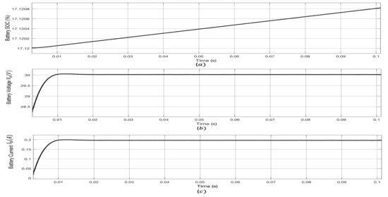 Waveforms for the battery load with the nominal voltage of 24 V and irradiance of 900 W/m: (a) battery ; (b) battery voltage ; (c) battery current .