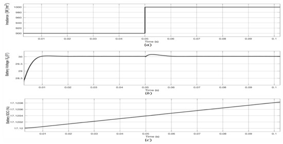 Waveforms for the battery load with the nominal voltage of 24 V with sudden change of irradiance from 900 to 1000 W/m: (a) irradiance W/m; (b) battery voltage ; (c) battery .