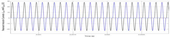 Due to the parallel topology adopted in this work, the ripple of the output voltage is reduced significantly. From Figure 17, it is evident that the output voltage ripple is approximately 1.5 V without interleaving boost converter; however, for the utilized two-stage parallel topology, the output voltage ripple is dropped down to 0.2 V, as shown in Figure 18. Furthermore, Figure 19 shows the currents of the resonant inductors and . The resonant inductors’ currents increase and decrease sinuously according to the gate signals.
