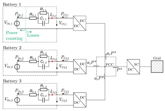 The batteries, as well as the power electronics, are considered in the applied model. Since the AC–DC inverter is located behind the PCC, as shown in Figure 1, its impact on the power split can be neglected.