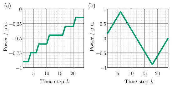 The PFCSs mentioned in Section 2.2 are analyzed for an unidirectional and a bidirectional load profile, shown in Figure 2. Both load profiles are normalized to the power . The magnitude of the load profile can be adjusted without changing the optimization problem itself (provided that the energies are adjusted accordingly), as discussed in Section 5.1. Furthermore, a broad range of the state space and the separation of charging and discharging are considered. The load profile I is based on a peak shaving profile. The minimum power request (maximum discharge power) is −0.9 p.u. and it gradually increases to −0.15 p.u. Load profile II consists of a charge and discharge process. Here, a maximum/minimum power of 0.9 p.u. is reached. The power increases/decreases with a rate of 0.15 p.u. per time step. Both profiles have 24 time steps.