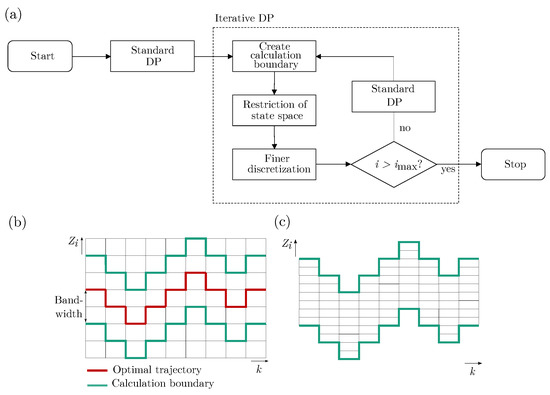 Figure 3b illustrates the determination of the bandwidth. Here, a calculation boundary is set around the optimal trajectory of the states of the standard DP of step 1. The bandwidth is a multiple of a discretization step of the standard DP and chosen to be 2 in this example. It is chosen equidistantly in both directions around the optimal state trajectory. The finer discretization from step 4 in the restricted state space is shown in Figure 3c. In both figures, the time step-dependent restriction of the state space is represented.