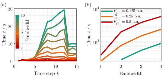 The bandwidth influence on the time step specific calculation speed is shown in Figure 5a for bandwidths from 1 to 10 in a step size of 1. It can be seen that a higher calculation band leads to a longer calculation time. This is attributed to the larger state space and thus, the greater number of computational operations. The effect is also shown in the total and mean value of the calculation time in Table 1. Furthermore, the calculation speed varies with the time step, which is due to the different decision spaces of the time steps. The highest computational effort can be found at the time steps, where each battery energy system can provide the power request itself as well as in combination with other batteries. The standard deviation of the calculation time shows that the influence of the decision combinations is directly coupled with the bandwidth. The minor shifts of the peak characteristics with the same decision space are attributed to the different CPU loads during the simulations. As shown in Figure 5b, the total calculation time of the first iteration depends not only on the bandwidth, but also on the discretization of the pre-loop. Here, the discretization of the first iteration is set to 0.0625 p.u. for all calculation scenarios. The discretization of the pre-loop directly influences the state space since the discretization of the state is directly coupled through Equation (23) to the minimum step of a decision.