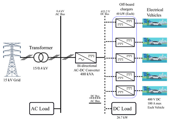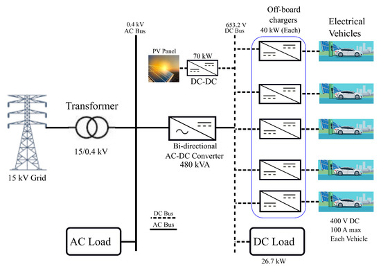 The Figure 1 illustrates a micro-grid. The last consists of infinity power grid, various EV charging stations and the PV solar power system. Inside the same micro-grid, power electronics energy conversion is applied, the power flow is processed and various controls are performed in order to ensure the correct parameters. The EV and EMB form the load, while the EVs can serve as storage systems. The EV and EMB charging stations are mostly installed in cities, where in most countries, the medium voltage urban transmission grid is 15 [29]. The last is converted to a low voltage of 0.4 through a step-down transformer for distribution. In Figure 1, a microgrid is connected to the low voltage (0.4 ) side of the main grid. The low voltage in turn is obtained from 15 medium voltage grid through a transformer. Through the bi-directional AC-DC converter [30], the 653.2 V DC is supplied to the DC link. The PV power system supplies to the same DC bus of 653.2 V. In turn, the DC bus supplies the 40 off-board chargers for the EV charging and discharging and a 26.7 DC load. The DC load stands for EMBs or any other load. The 40 kW and 100 A off-board charger is chosen among the commercially available and most-used charging stations. The indicated off-board chargers are all above level 2 in the levels defined by the Society of Automotive Engineers [31]. They are Electric Vehicle Supply Equipment (EVSE) and categorized as level 3, as they can fast-charge (rated current of 100 A max) [32]. This work considers the micro-grid in Figure 1. Hence, the study will focus on the grid behavior facing the power flow from/to EVs with PV power system support. Before elaborating in detail on the behaviors of the grid, this work will first elaborate more on the bi-directional flow of energy, energy conversion, solar power harvesting, the controls involved and charging/discharging of the EV batteries. Simulink is used as a tool to simulate and achieve the required results.