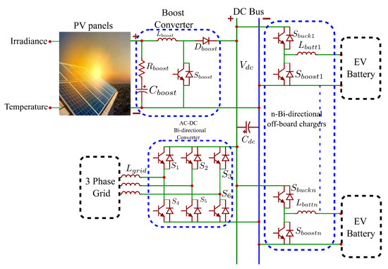 The off-board charger with bi-directional capabilities is considered. It links the EV with the rest of the network through a DC link. The mentioned off-board charger is for the plug-in option.
