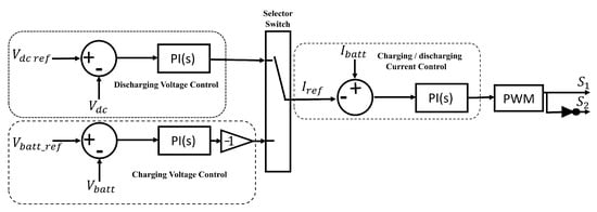 When the EV battery has to send the power back to the grid, or to a certain load (part of the grid), the booster is necessary. The battery voltage is on a lower level, so it needs to be boosted to a voltage level of the DC link. During the V2G, the battery current is positive (discharging current), the battery voltage is constant (CV) until the current reaches the cut-off (CC). Hence, the voltage starts decreasing. The SOC in this case decreases as well. The battery voltage will keep decreasing until the SOC reaches zero, the battery current will drop to zero and the discharging is completed. Considering Figure 5 in the boost mode, the lower switch () and the upper-switch ant-parallel diode are operated. The DC link capacitor is enough to stabilize the DC link on the required voltage, and the booster mode is illustrated in Equation (3).