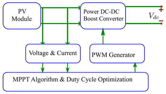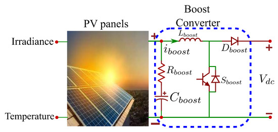 Figure 8 springs from Figure 2, and illustrates the process of generating solar power and feeding it to the DC link [35]. It is made from the PV array and the DC-DC converter. The last is a booster that takes the PV array voltage to the DC link-required voltage level. The PV array gives DC solar power to the main DC link through the DC-DC converter. The control on this point is built to inject the solar power to the main DC link (and to the grid). The power generated from the PV array is obtained through a circuitry shown in Figure 8. It is made of a PV array composed of 14 series modules on 17 parallel strings. The last configuration is hit by the solar radiation at a given weather temperature and generates solar power (at a given voltage and current level).