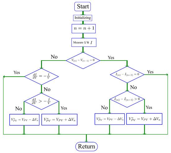 The PV module current and voltage are used in the MPPT algorithm and come up with the suitable duty cycle that for the right PWM control. The Figure 10 shows the incremental conductance algorithm for MPPT implementation.